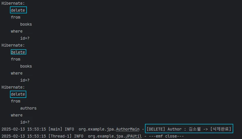 - id=4인 Author를 삭제함과 동시에 Author의 Book들도 함께 삭제 되는 것을 확인 가능