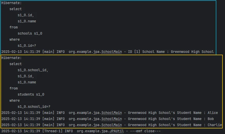 ➡️ 두번째 리스트를 순회하며 얻은 학생들의 log.info() 또한 잘 가져와짐 - students 리스트가 채워지는 시점은 find(School.class, 1L)을 통해 가져오는 시점