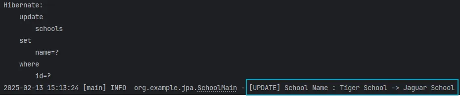 log.info("[UPDATE] School Name : {} -> {}", beforeSchool, updatedSchool);