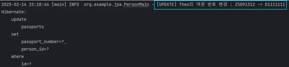 log.info("[UPDATE] {}의 여권 번호 변경 : {} -> {}", person.getName(), beforePNum, passport.getPassportNumber());