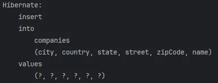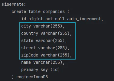 - Company 엔티티의 필드인 id, name과 함께 Address에서 공통된 속성으로 정의했던 필드들도 함께테이블로 생성됨