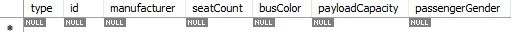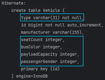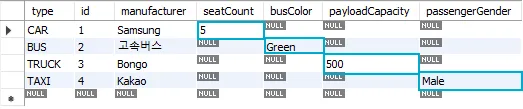 - 각기 다른 클래스들의 컬럼들이 Vehicle 하나의 테이블에 선언되어 만들어짐