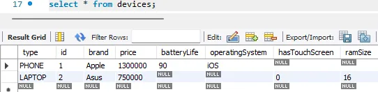 - 단일 테이블 전략이므로 devices라는 하나의 테이블에서 모든 컬럼이 관리되고 있다.