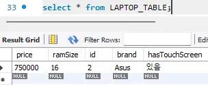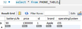 - 기본키값인 id를 제외하고는 부모클래스 Devices의 필드인 brand, price들은 각각 테이블에 포함되어있지 않음