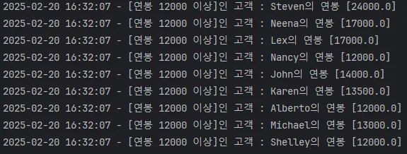 findMoreSalary.forEach(employee -> log.info("[연봉 12000 이상]인 고객 : {}의 연봉 [{}]", employee.getFirstName(), employee.getSalary()));