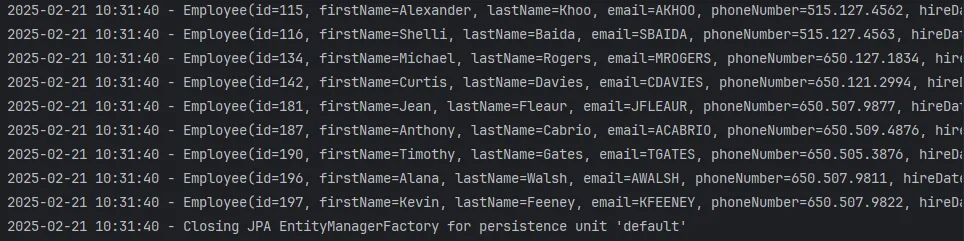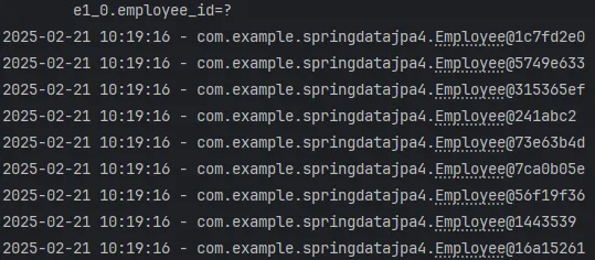forEach()를 통해 log.info()로 employee.toString()을 출력하였지만 제대로 출력되지 않았다.