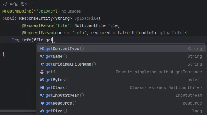 - MultipartFile 로부터 다양한 메소드를 통해 파일의 정보를 꺼내올 수 있다.