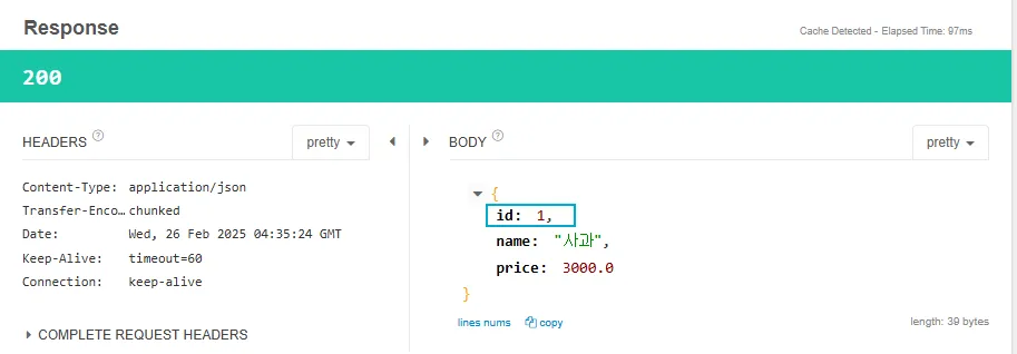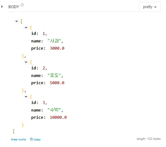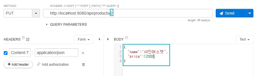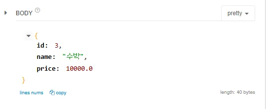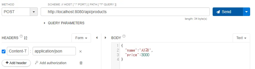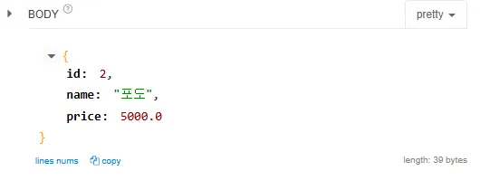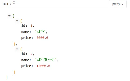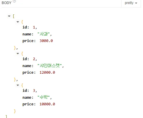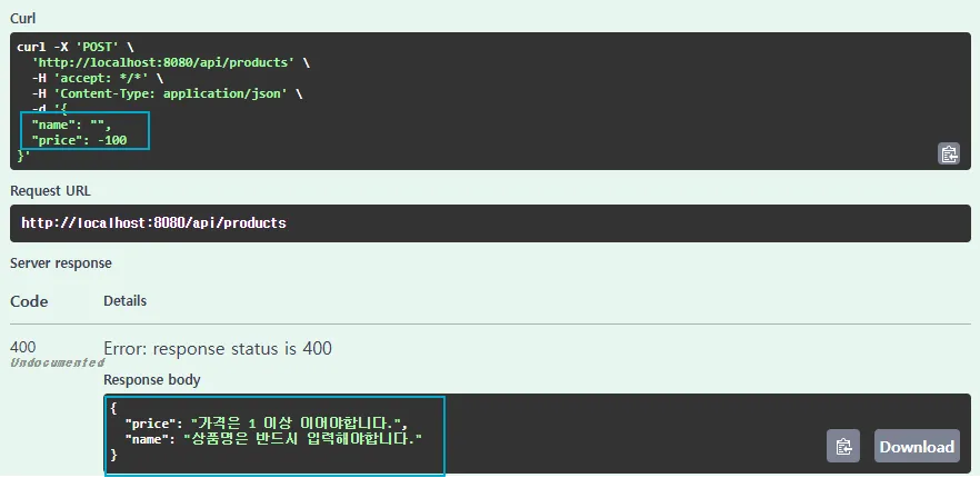 - name은 공백, price는 음수가 입력되었을때 ResponseBody에 json형태로 예외 문구가 출력되는 것을 확인 가능