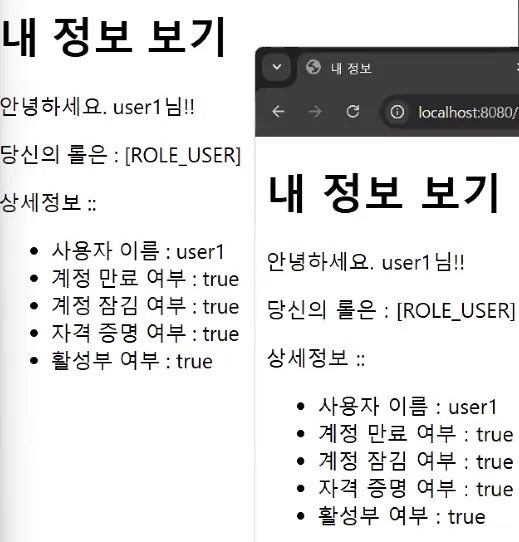 - ์ฌ์ฉ์๊ฐ ๋ก๊ทธ์ธํ๋ฉด ์ฌ์ฉ์์ ์ธ์ฆ์ํ, ์ฌ์ฉ์ ๊ถํ์ ๋ณด๊ฐ ์ธ์ ์ ์ ์ฅ๋๋ ๊ฒ