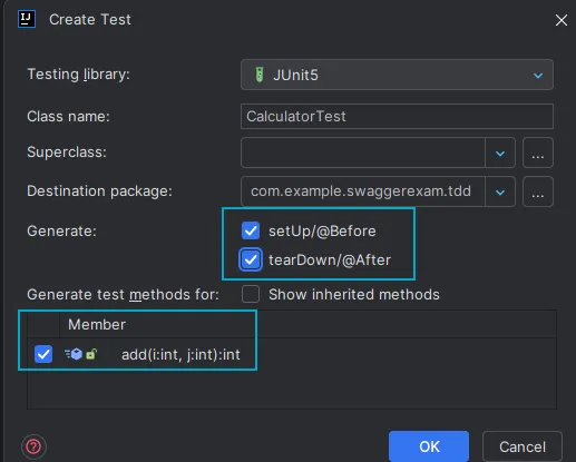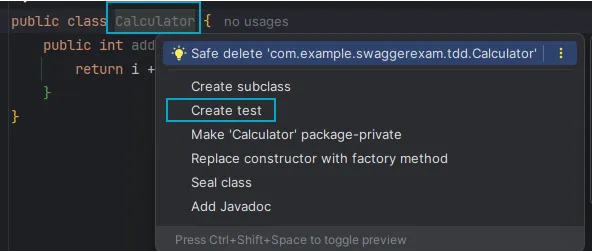 - 클래스명에서 Alt + Enter를 누르면 Create Test를 만들수도 있다.