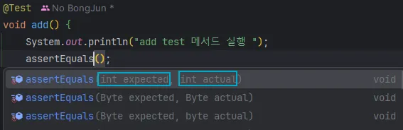 - 이처럼 IntelliJ 상에서 만들어져있는 test 패키지에서 JUnit 테스트 클래스를 만들게 된다.