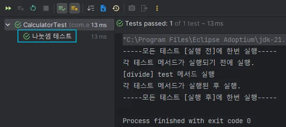 - @DisplayName 사용으로 기존의 divide()만 출력되던것을 직관적으로 표시되도록 변경 가능