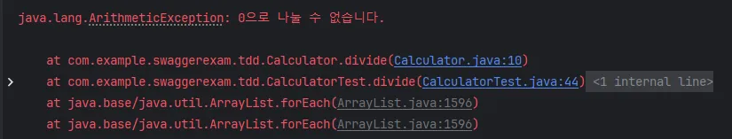 // assertEquals(0.0, cal.divide(20, 0)); // 예외발생 테스트케이스