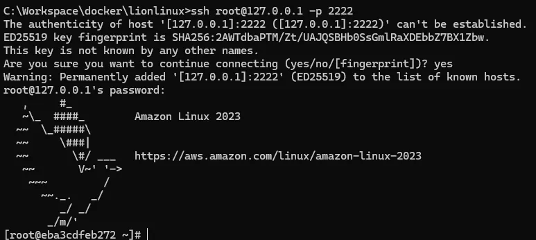 - Docker가 컨테이너의 22번 포트를 호스트의 2222번 포트와 연결했기 때문에 127.0.0.1:2222로 접속하면