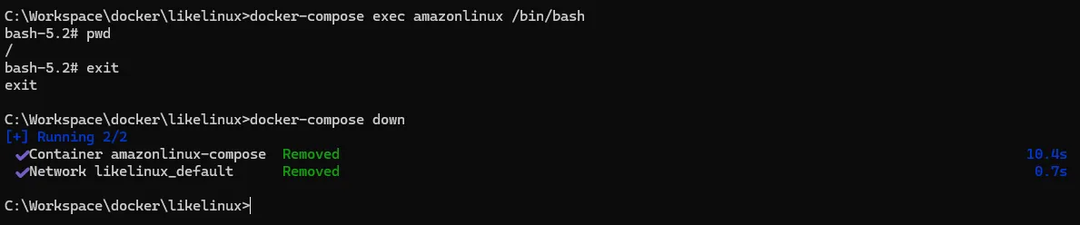 docker run -it —name likelinux [amazonlinux의 IMAGE ID] [컨테이너 시작 시 실행할 프로그램]