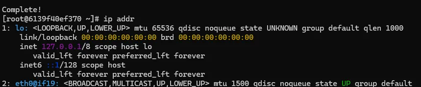 - 컨테이너 내 활성화된 네트워크 인터페이스, IP주소, 서브넷 마스크 등을 확인 가능