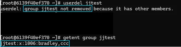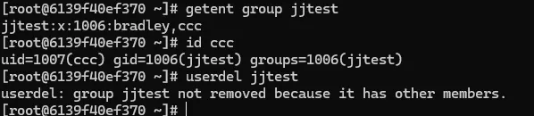 - getent group jjtest : jjtest의 그룹을 확인해보면 여전히 존재하는 그룹임을 확인가능