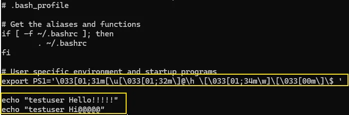 echo "export PS1='\\033[01;31m[\\u[\\033[01;32m]@\\h [\\033[01;34m\\w][\\033[00m]$ '" >> .bash_profile