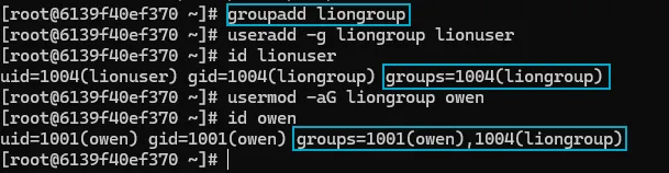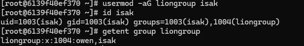 - usermod -aG liongroup owen