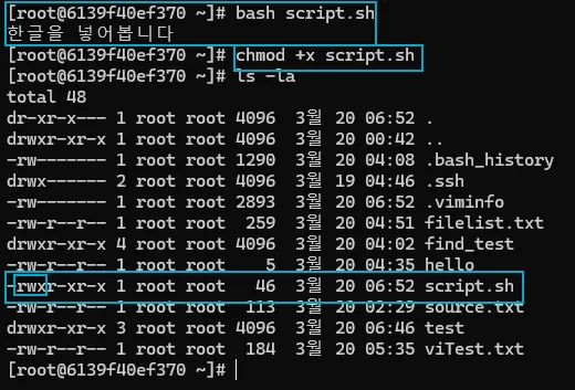 - 권한을 부여하고나면 (./script.sh) 이처럼 바로 실행이 될 수 있게된다.