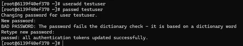 - 첫 유저 생성에는 BAD PASSWORD라고 8자이상, 보안에 취약한 비밀번호이면 경고를 출력하긴 하지만
