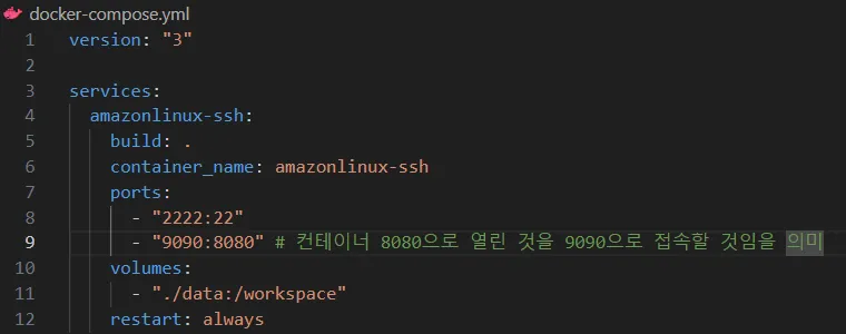 8080번 방에 접속하기 위해서는 그 컨테이너 밖에서는 9090로 접속하게끔 설정한 것 - ssh는 연결통로를 열어주는 역할 (도커의 컨테이너로 들어갈 수 있는 연결통로를 열어줌)