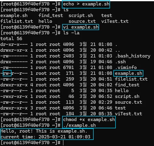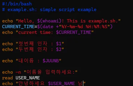 - echo로 example.sh를 만들고, vi로 내용을 작성한다.