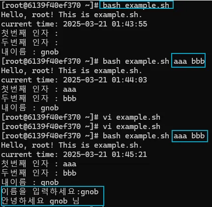 #!/bin/bash echo "첫 번째 인자: $1" echo "두 번째 인자: $2"