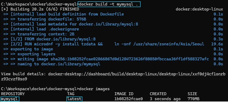 태그를 지정해주지 않으면 기본값으로 최신 (latest)를 받아온 것 - docker images로 확인해보면 mymysql이미지가 잘 생성된 것을 확인 가능