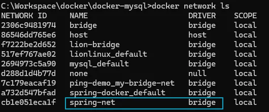 C:\\Workspace\\docker\\docker-mysql>docker network create --driver bridge spring-net