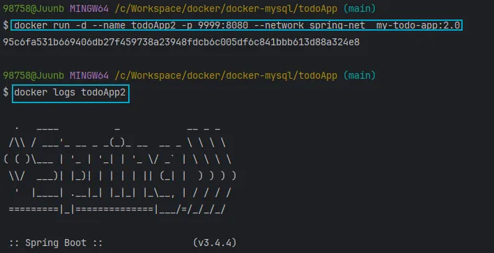 ➡️-d 백그라운드 실행으로 이름은 todoAp, 8080포트를 8888로 연결, my-todo-app 은 1.0버전으로 매핑