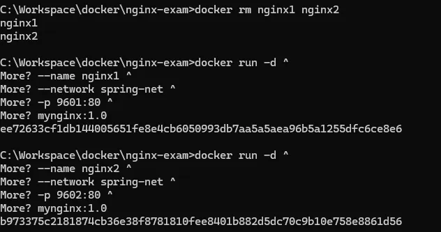 - docker rm nginx1 nginx2 : 기존것들은 지우고 새롭게 만든다.