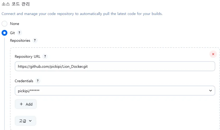 - Configuration 설정으로 소스코드관리를 들어가서 Git으로 설정 후 만들어놓은 Credentials과 저장소 주소를 넣는다.