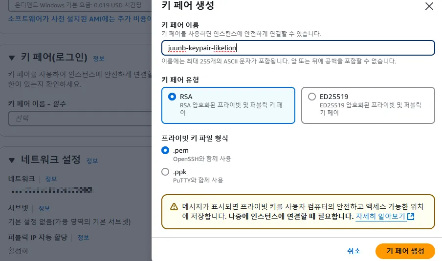 - openSSH를 사용하도록 .pem방식으로 생성