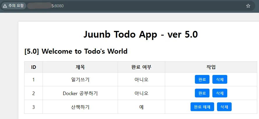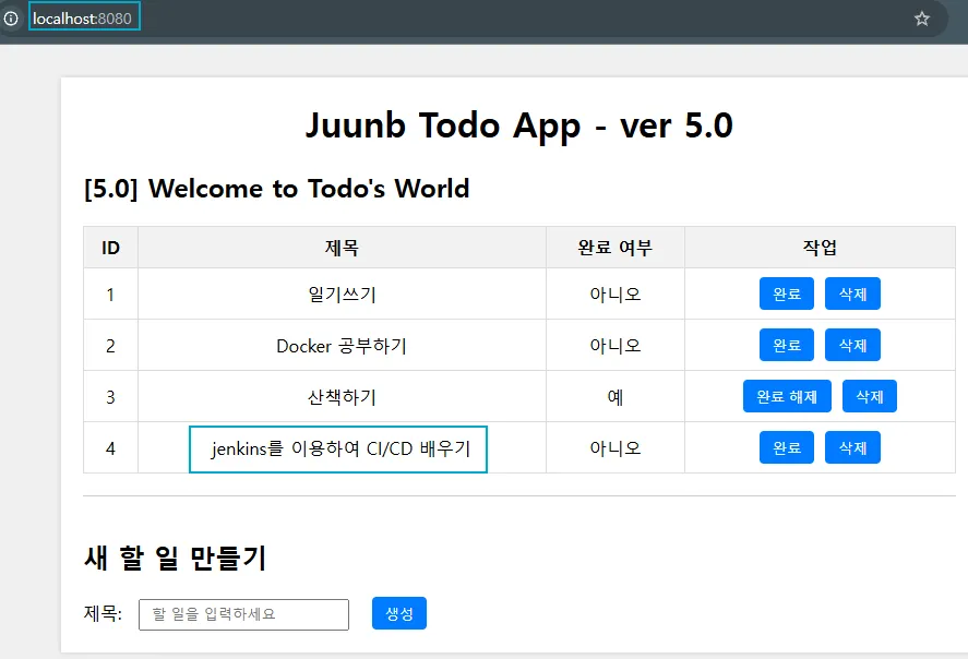 - localhost:8080 에 접속하여 접속이 잘되는지 테스트 후 새 할일도 추가해볼 수 있다.