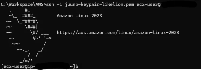 - ssh -i juunb-keypair-likelion.pem ec2-user@[퍼블릭IPv4주소]