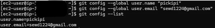 - 서버에 git 설치 후 config로 유저이름과 유저이메일 설정 ➡️ec2의 서버에 적용완료