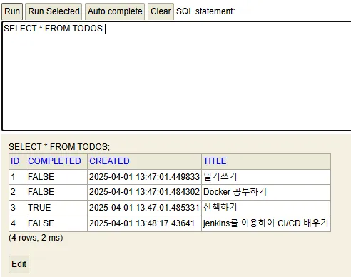 - testdb.mv.db 파일을 삭제하지 않는 이상 지금까지 계속 쌓아놓는 할일들은 그대로 유지