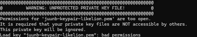 ➡️윈도우에서 pem 권한 변경 시 이러한 오류가 발생할 수 있음 - ✅icacls 명령어를 활용하여 권한을 변경해준다.