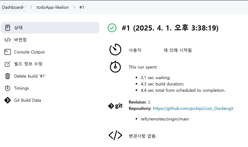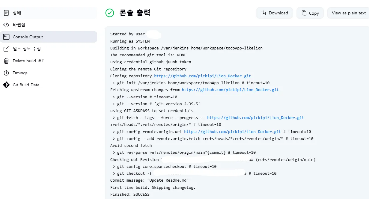 이처럼 빌드에 대한 정보를 확인할 수 있고 Console Output을 눌러서 확인해보면