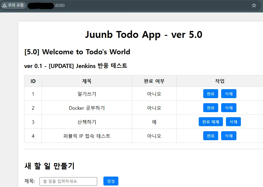 - [publicIPv4주소]:8080 에 접속해보면 변경했던 내용과 함께 App이 잘 실행되는 것을 확인 가능