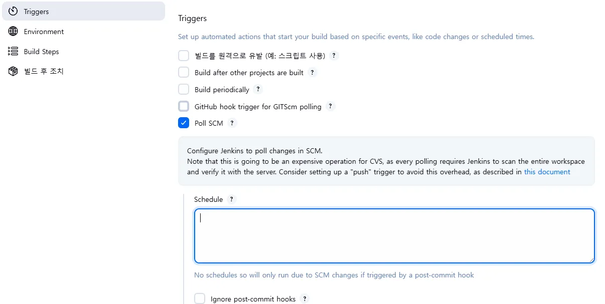 - Poll SCM Jenkins가 일정 주기로 Git 저장소를 확인(폴링)하여 변경 사항이 있는지 검사하는 것