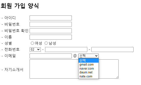 └ 이메일 : 전화번호와 마찬가지로 select 태그로 하위 option에 여러 개의 이메일 주소 형식을 지정합니다.