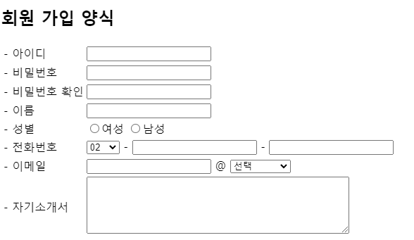 필요한 요소 : 아이디 / 비밀번호 / 비밀번호 확인 / 이름 / 성별 / 전화번호 / 이메일 / 자기소개