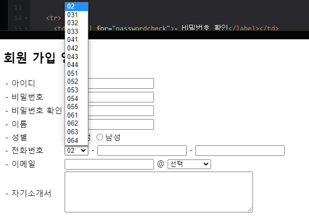 └ 전화번호 : select 태그로 하위 option에 지역번호를 넣어주어 가장 처음 지역번호를 선택할 수 있게 지정합니다.