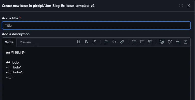 - new issue 클릭 후 만들어놓은 issue_template_v2 를 선택하면 이처럼 바로 템플릿이 표시되는 것을 확인 가능