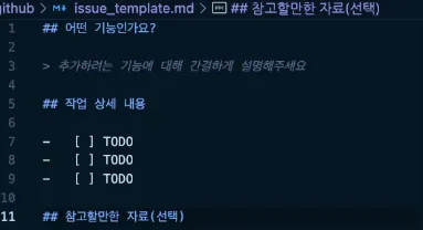 - issue_template.md 로 이슈의 기본 형식을 지정해줄 수 있음