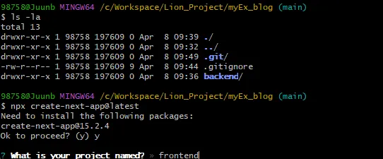 - 진행했던 프로젝트의 root 디렉토리에서 backend 디렉토리와 같은 라인으로 만들어줌 (frontend)