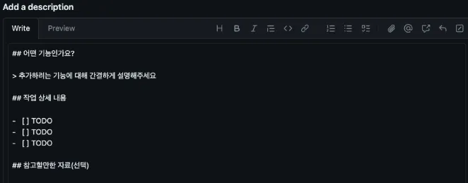- 이슈를 만들고자 할때 기본 템플릿이 표시되는 것을 확인 가능