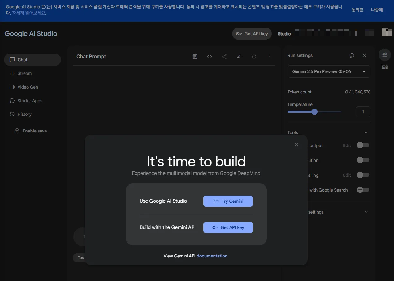 - 구글 AI 스튜디오 접속 후 에서 API Key 발급받기